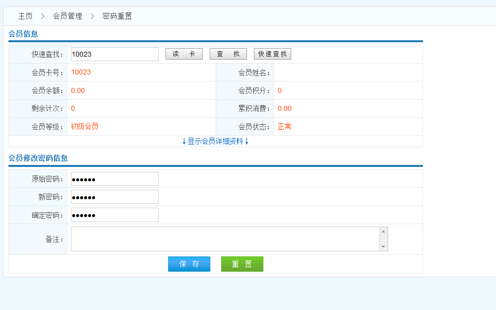 操作流程: 查找會員------>驗證密碼(根據(jù)系統(tǒng)參數(shù)設(shè)置 選填)------>錄入新密碼------>保存------>密碼重置成功
